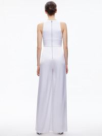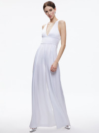 This white jumpsuit is your new sub-in for your standard LBD. With a deep V-neckline, pleating at the front and satin finish, it's incredibly striking but also very easy to wear (a 30 second outfit to be honest). Just add your favorite accessories and you'll be the best dressed. PRODUCT DETAILS - Jumpsuit - Deep V-neck - Wide waistband - Back zipper closure - Wide leg - Pleated front - Satin finish - Front rise: 11” - Back rise: 14 3/4” - Body: 80% triacetate, 20% polyester - Lining: 94% polyester, 6% elastane - Fits true to size, take your normal size - Mattie is wearing a size 2 and her measurements are 5'10", 32" bust, 24" waist, and 34" hip - Fits true to size, take your normal size - Dry clean only