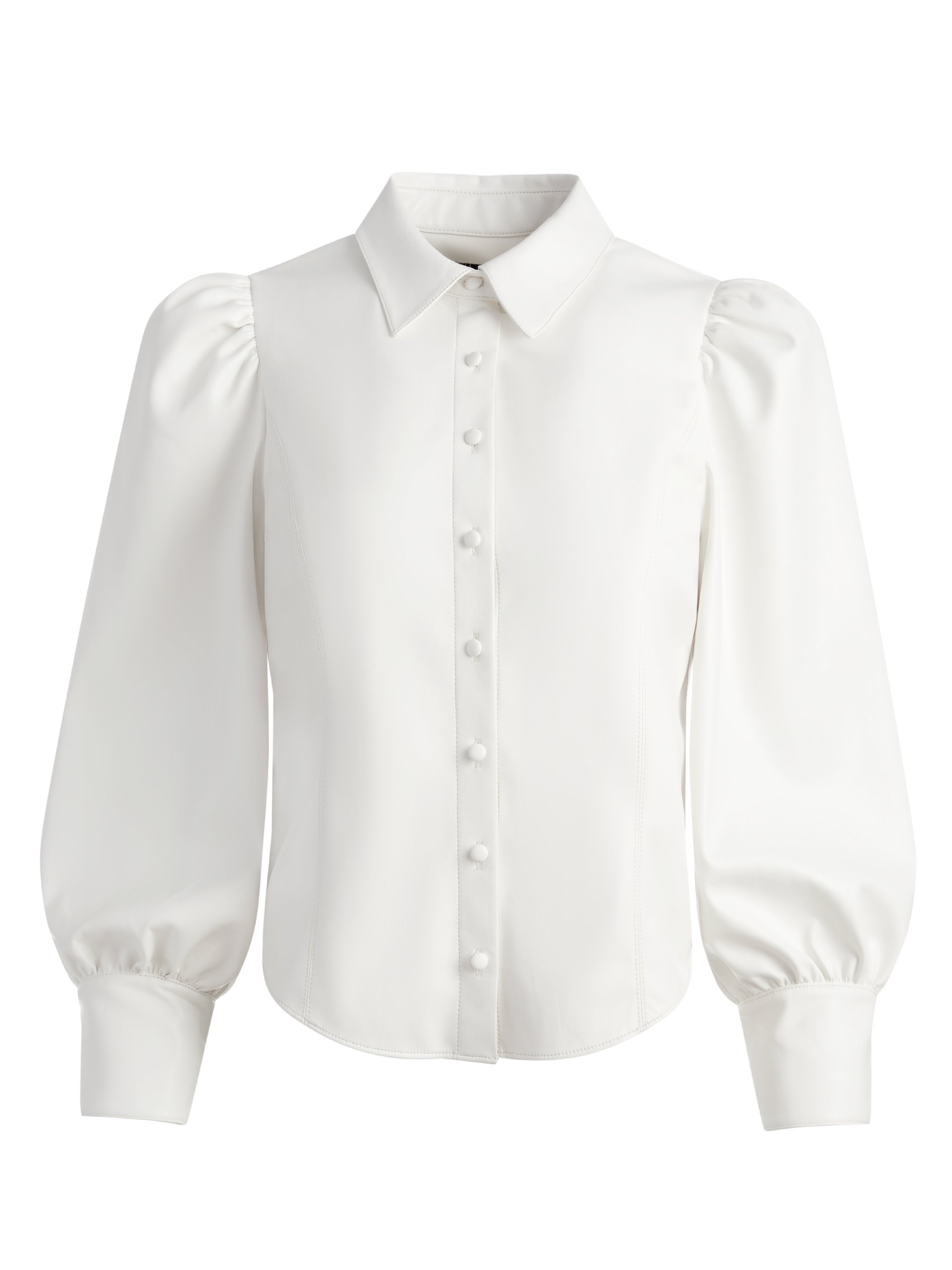 This gorgeous vegan leather puff sleeve blouse with a collar, long sleeves and button front closure will ensure you'll never have outfit regret. PRODUCT DETAILS - Vegan leather - Collared - Button front closure - 3/4 puff sleeves - Cinched cuffs at wrist - Total length: 21 1/2” - 100% polyurethane - Fits true to size, take your normal size - Aqua is wearing a size Small and her measurements are 5’10”, 32” bust, 23” waist, 34” hips - Dry clean only - Imported