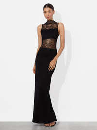 The lace bodysuit that broke the internet, now reimagined as a floor-length gown. Nichol features sheer lace paneling, a sculpted bandeau lining, and a mock neck that feels both covered and sultry. The soft stretch jersey lets it hug in all the right places, while the back slit keeps things moving. It’s romantic, sexy, and guaranteed to stun. DETAILS - Maxi dress - Stretch jersey with lace mixed media - Bandeau lining - Mock neck - Back slit - Back zipper closure - 96% viscose, 4% elastane - Dry clean only - Imported FIT - Model is 5'10" and wearing a size 0 - Length from the shoulder: 61" - Fits true to size, take your normal size