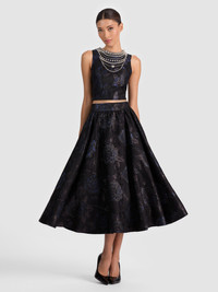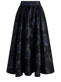A midi skirt with a maxi impact, Nilda is crafted in a rose printed jacquard that feels so effortlessly timeless. Pair her with a simple tank to balance out the voluminous silhouette, or throw on a blazer for a more sophisticated look. DETAILS - Midi skirt - Floral jacquard - High rise - Wide waistband - Back zipper closure - Lined - 74% polyester, 26% cotton - Dry clean only - Imported FIT - Model is 5'10" and wearing a size 0 - Skirt length: 30 1/2" - Fits true to size, take your normal size