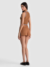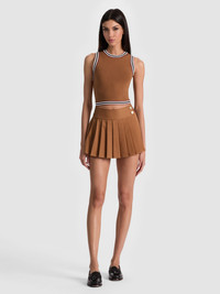 A preppy essential with unexpected detail. The Noah mini is cut in twill sateen with a box-pleated flap overlay, secured by gold buttons for a faux-wrap effect. Flirty and tailored, it plays nicely with crisp shirts or soft knits-and promises maximum mileage for all your summer prep moments. DETAILS - Mini skirt - Twill sateen - Pleated wrap front with gold button closures - Shorts in back - Side stripe - Back zipper closure - 64% polyester, 32% viscose, 4% elastane - Dry clean only - Imported FIT - Model is 5'10" and wearing a size 0 - Length: 12 1/2" - Fits true to size, take your normal size