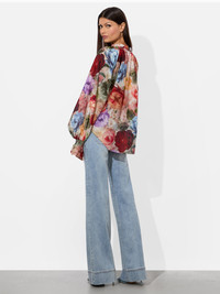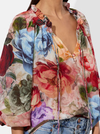 Super ethereal and romantic, this printed peasant blouse is the height of feminine sophistication. Its cotton-silk body is cut into a beautifully billowy and floaty shape. A self-tie, high-collar, smocked cuffs, and blouson sleeves add to its hippie aura. DETAILS - Peasant blouse - Printed crepe rayon - Bishop sleeves - Tie neck - 70% cotton, 30% silk - Dry clean only - Imported FIT - Model is 5'10" and wearing a size XS - Length from the shoulder: 23" - Runs large, we recommend sizing down one size