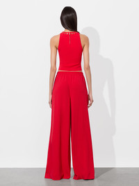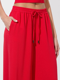 The comfort of your favorite sweatpants, but make it luxe. These red wide leg pants are crafted in a drapey stretch crepe that moves like silk but feels like pajamas. With a high-rise drawstring waist and semi-sheer, flowy finish, they’re equal parts polished and effortless. Pair them with a fitted tank or matching top for a vibe that says "I didn’t try hard" (but look amazing). DETAILS - Pull on pant - Wide leg - Drawstring waist - High rise - Drapey sheer stretch crepe - 97% polyester, 3% elastane - Dry clean only - Imported FIT - Model is 5'10" and wearing a size XS - Front rise: 10 1/2" - Inseam: 33" - Fits true to size, take your normal size