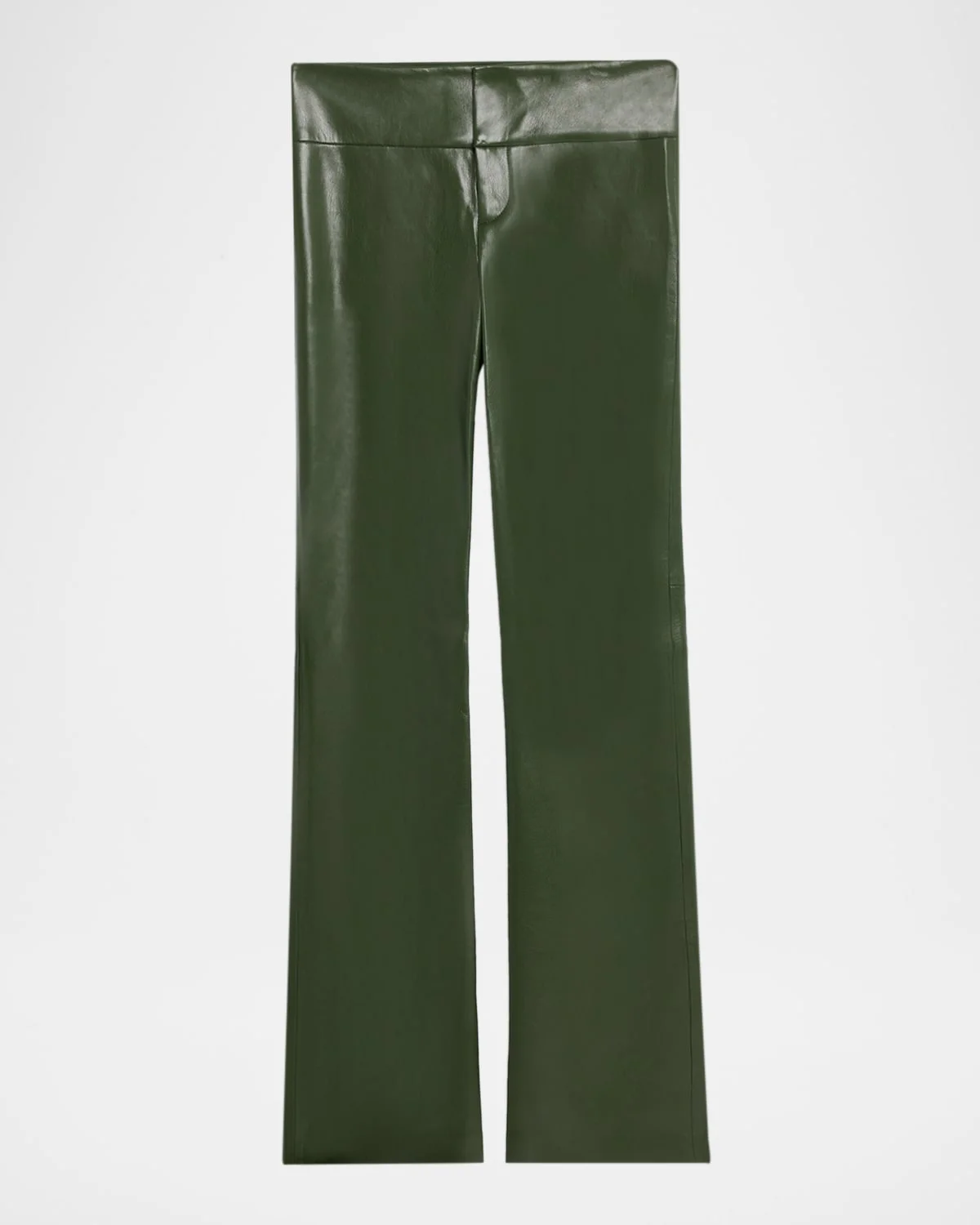 The "Olivia" pants by Alice + Olivia are crafted from soft vegan leather (PU/polyester) with a sleek bootcut leg and a wide waistband Approx. 9" rise; 34.8" inseam Low rise Back welt pockets Full length Flared legs Hidden hook/zip fly Polyurethane/polyester Lining: Recycled polyester Dry clean Imported