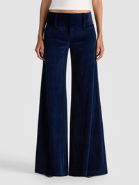 Our signature low rise flare pant is back, now in a fun indigo velvet that feels uniquely cool yet perfectly tailored for anything. Let Olivia take you from coffee to cocktails - she can do it all. DETAILS - Wide leg pant - Matte velvet - Low rise - Wide waistband - Hidden front hook and zipper closure - 90% polyester, 10% elastane - Dry clean only - Imported FIT - Model is 5'10" and wearing a size 0 - Front rise: 9" - Inseam: 34 3/4" - Fits true to size, take your normal size