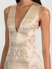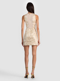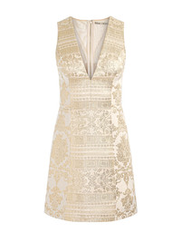 A metallic moment worth making an entrance for. Our Pacey mini dress stuns in shimmering printed jacquard, designed with an A-line silhouette that flatters and flows with every move. The plunging V-neckline adds a touch of allure, while a mesh back and zipper closure ensure a smooth, comfortable fit. Finished with a subtle sheen and striking detail, this standout style is guaranteed to be a conversation piece. DETAILS - Mini dress - Delicate gold floral lattice jacquard - Structured skirt - V-neck - Mesh back with zipper closure - 64% viscose, 36% polyester - Dry clean only - Imported FIT - Model is 5'10" and wearing a size 0 - Length from the shoulder: 33" - Fits true to size, take your normal size