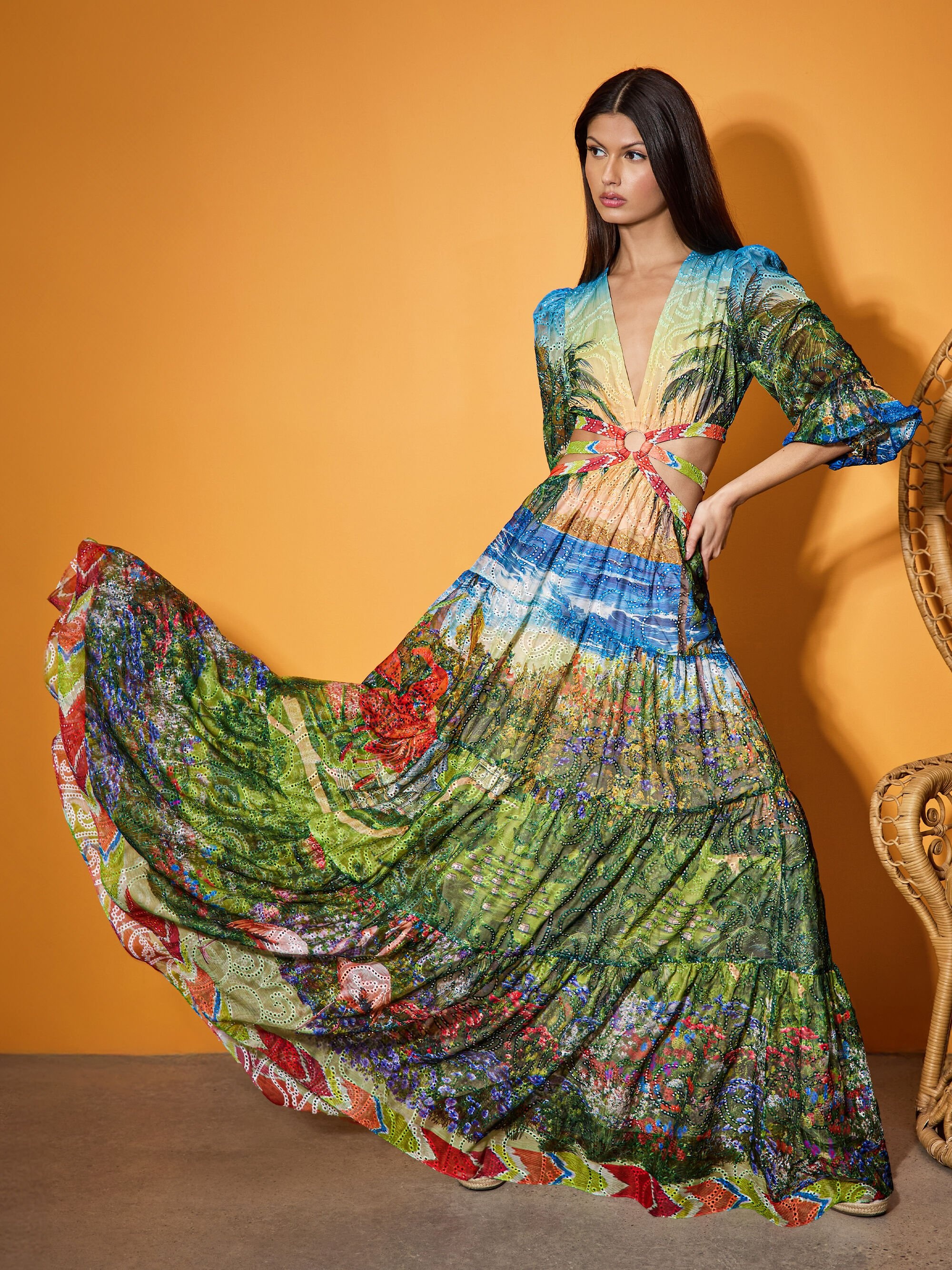 Our bestselling Patrica maxi is back, this time in a tropical island print that instantly transports us to vacation mode. This fan favorite returns with all the drama you loved: sheer blouson sleeves, a deep V neckline, and a perfectly placed waist cutout that flatters at every angle. It's lined through the body for coverage but keeps things breezy with its sheer sleeves and embroidered paisley eyelet detailing. Consider this your go-to for your next destination getaway. DETAILS - Maxi dress - Embroidered paisley eyelet - Cutout waist with tie back closure - Sheer blouson sleeves - Lined - Tiered skirt - 100% polyester - Dry clean only - Imported FIT - Model is 5'10" and wearing a size 0 - Length from the shoulder: 60" - Fits true to size, take your normal size