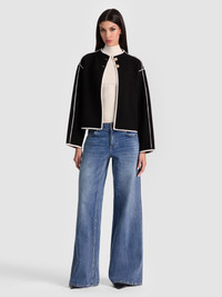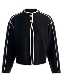 Prep with punch. The Pearson jacket blends the comfort of a sweater with the polish of a jacket. The open front design keeps it effortless, while black and white color blocking and a funnel collar add that elevated, pulled-together vibe. Wear as a light jacket now, or as a sweater under your parka later. DETAILS - Wool sweater jacket - Cropped - Funnel neck - Boxy fit - Gold button closures - 99% merino wool, 1% elastane - Dry clean only - Imported FIT - Model is 5'10" and wearing a size XS - Length from the shoulder: 21 3/4" - Fits true to size, take your normal size