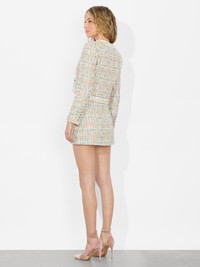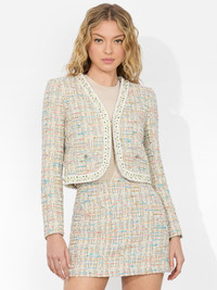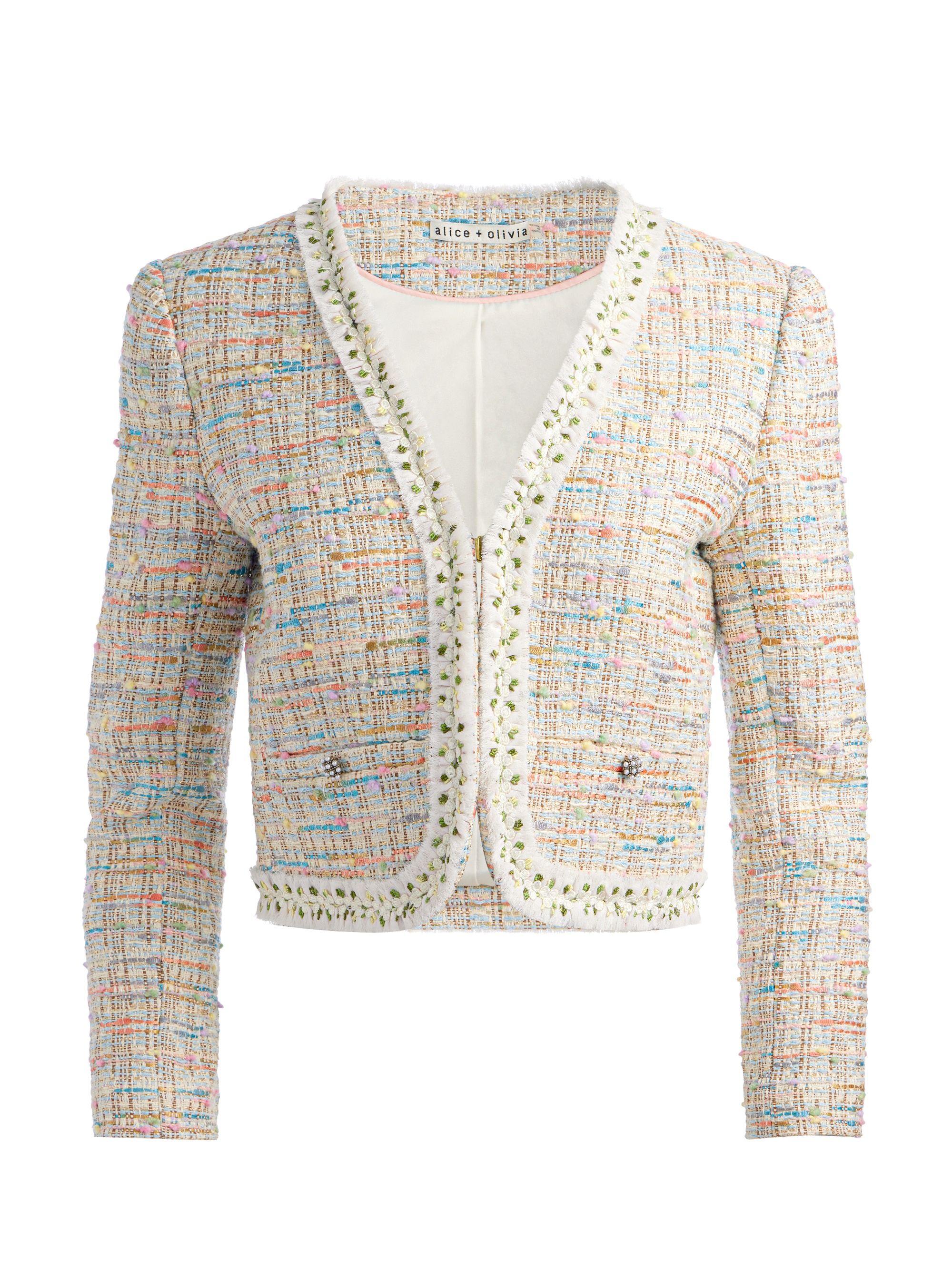Timeless elegance meets playful charm in this cropped tweed jacket. Woven with soft pastel threads, our Peyton a fresh take on classic tailoring. The floral embroidered trim and wispy fringe trim add a bohemian touch, while pearl embellishments bring just the right amount of polish. Chic, feminine, and effortlessly sleek-your new go-to statement layer. DETAILS - Tweed jacket - Cropped - Floral embroidered trim - Lined - Front hook closure - Embellished buttons - 69% cotton, 9% nylon, 8% acrylic, 5% viscose, 4% other fibers, 3% wool, 2% polyester - Dry clean only - Imported FIT - Model is 5'10" and wearing a size Small - Length from the shoulder: 15 1/2" - Fits true to size, take your normal size