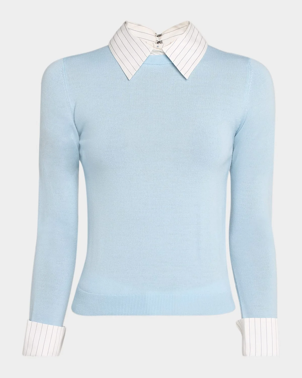 Designed with versatility in mind, the "Porla" sweater by Alice + Olivia features a removable striped collar and matching cuffs Crew neckline Long sleeves Slim fit Hip length Center back zipper Wool/elastane Dry clean Imported
