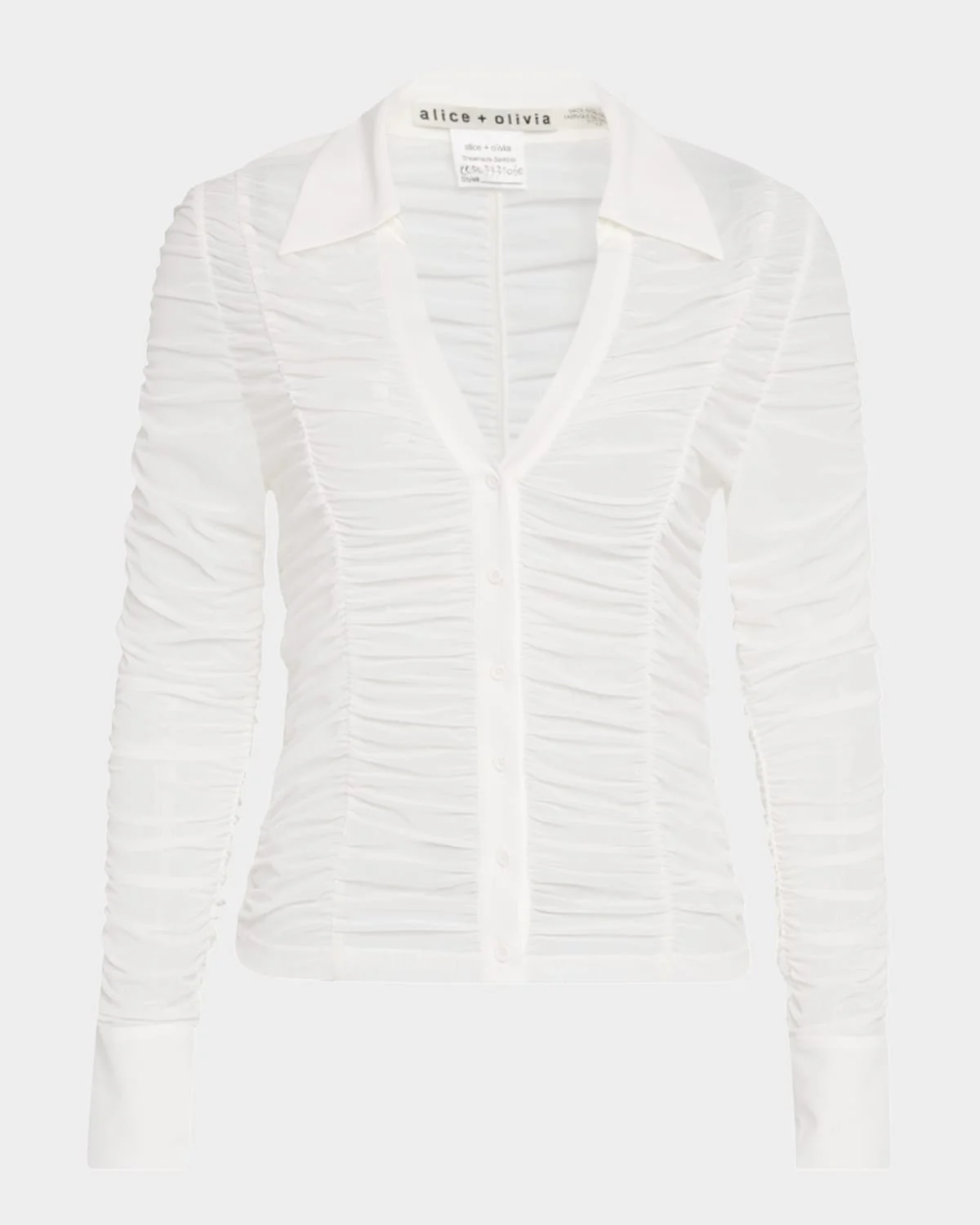 - Alice + Olivia "Portia" fitted shirt presented in a flattering ruched mesh construction - Approx. 20.3"L from shoulder to hem - Collared V neckline - Long sleeves; approx. 18"L - Hip length - Button front closure - Polyester/elastane - Unlined - Dry clean - Imported