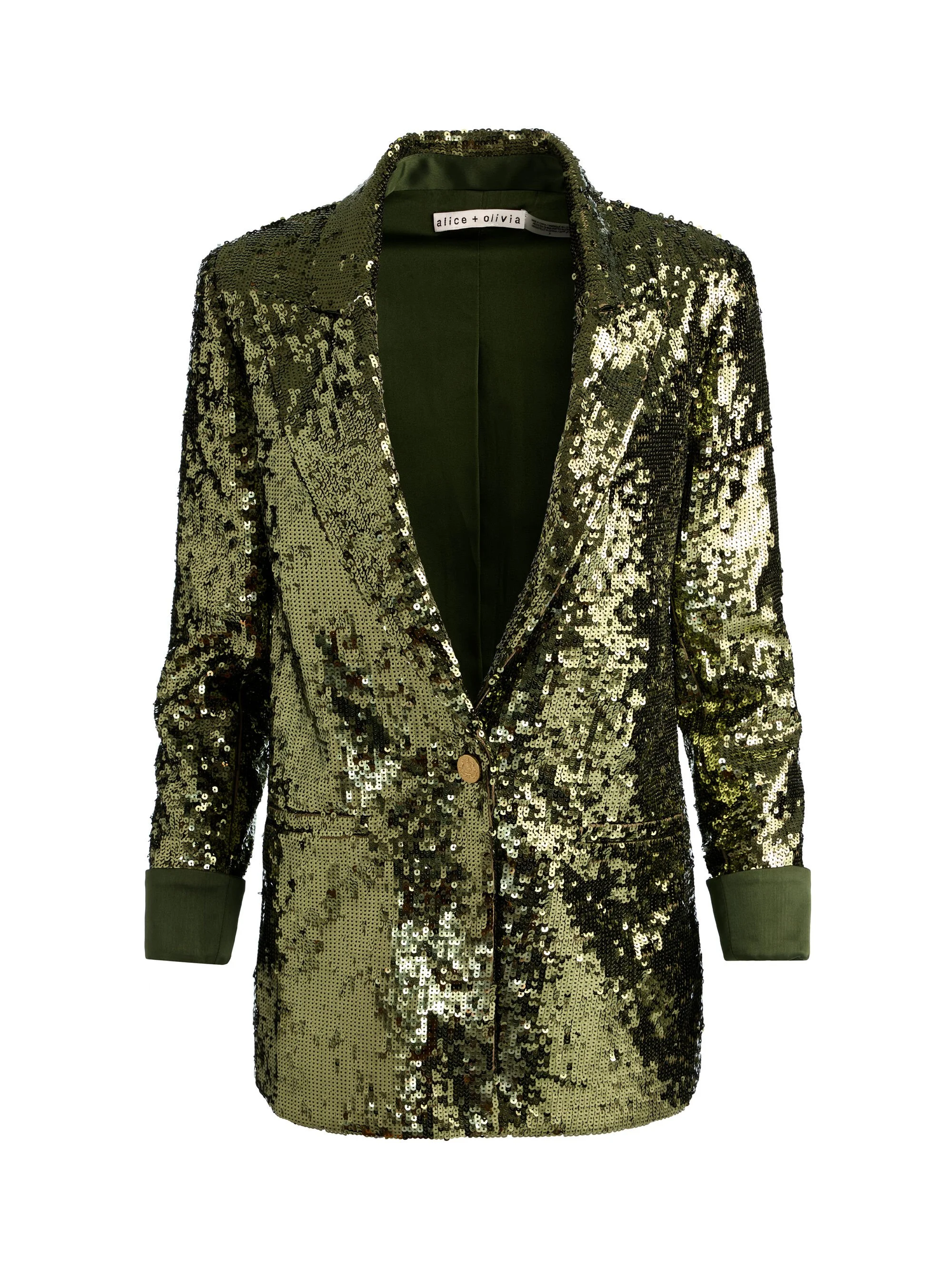 Introducing After Five, our new cocktail dressing collection--because it's 5 o'clock somewhere. The Quincy blazer turns every entrance into an event, drenched in sequins that shimmer with every step. Its oversized fit and strong shoulders bring that cool girl vibe, while the sparkling surface adds undeniable drama. Perfect for a night out or a stage-worthy moment, it brings instant energy to your look. Wear it with its matching pants or denim alike--it's pure star power. DETAILS - Sequined blazer - Embellished stretch georgette - Lined satin interior - Oversized fit - Strong shoulders - Front button closure - 95% polyester, 5% elastane - Dry clean only - Imported FIT - Model is 5'10" and wearing a size 2 - Length from the shoulder: 30" - Runs large, we recommend sizing down one size for a slimmer fit