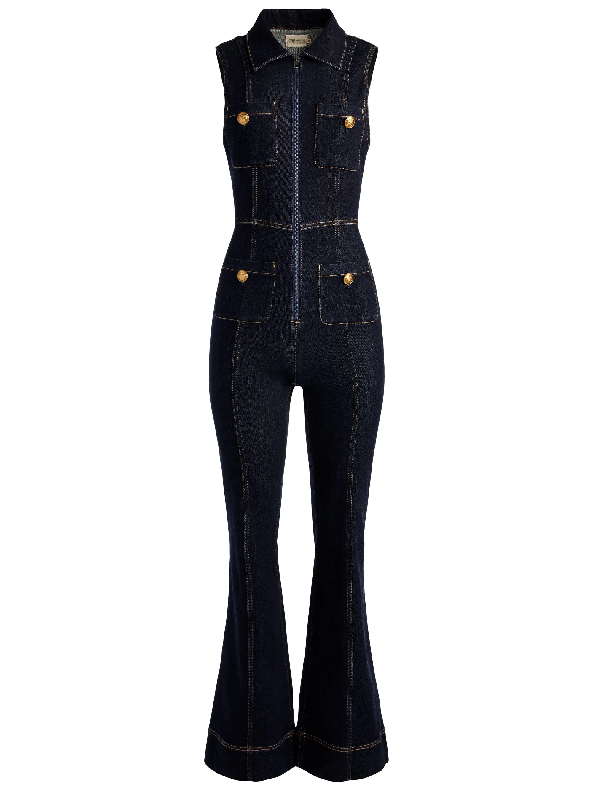 Utility meets polish. This denim jumpsuit is as versatile as it is comfortable. It features a collared neckline, four front pockets, and gold button details. The bootcut leg elongates the silhouette, while the front zip makes it easy to wear. The kind of piece you can throw on for daytime outings or style up for evening- it’s denim at its most versatile. DETAILS - Denim jumpsuit - Bootcut - Sleeveless - Collared - Front pockets with embellished gold buttons - Front zipper closure - 91% cotton, 5% elastomultiester, 1% elastane - Dry clean only - Imported FIT - Model is 5'10" and wearing a size 24 - Length from the shoulder: 61 1/2" - Fits true to size, take your normal size