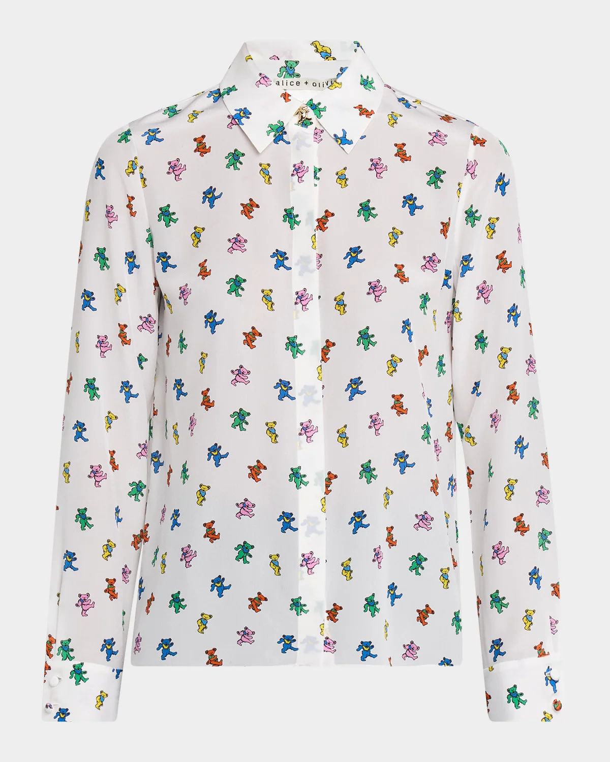Made from silk crepe de chine, the "Willa" blouse by Alice + Olivia is illustrated with eyecatching rainbow bear motifs Approx. 24.5"L from shoulder to hem Crisp shirt collar; hidden placket Long sleeves with button cuffs; approx. 31.3"L Yoked back Relaxed fit Hip length Silk Imported
