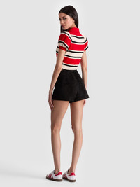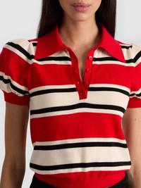 Colorful, cropped, and just a little bit retro. The Ramona pullover is a playful take on the classic knit-with puff sleeves, a contrast button front, and bold horizontal stripes in a rich, unexpected palette. It’s the kind of cozy that still looks pulled together. Style it solo or layer it under a blazer for that extra preppy punch. DETAILS - Striped pullover - Cropped - Collared - Puffed sleeve - Front button closure - 96% cotton, 4% nylon - Dry clean only - Imported FIT - Model is 5'10" and wearing a size XS - Length from the shoulder: 20 1/2" - Fits true to size, take your normal size
