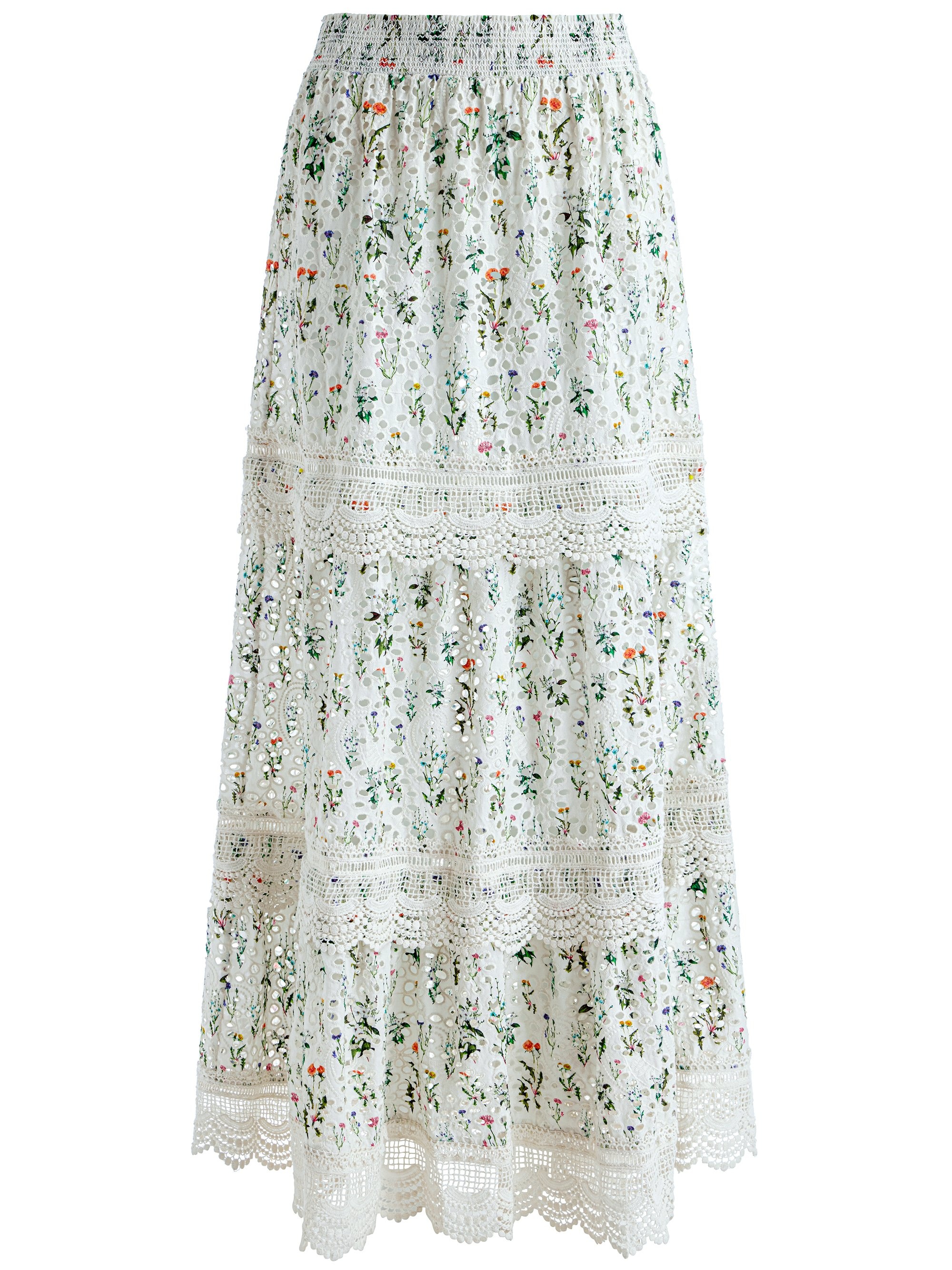The perfect amount of prairie vibes, this panelled maxiskirt is so special with layers of lace. It feels like a vintage piece that you hunt for but can never find. It's a feminine design that goes just as well with boots as it does with sandals. DETAILS - Floral maxi skirt - Embroidered - Tiered - Smocked waist - Crochet detailing - Exposed zipper back closure - 100% cotton - Dry clean only - Imported FIT - Model is wearing a size 2 and her measurements are 5’10”, 32” bust, 22.5” waist, 34.5” hip - Total length: 40 1/2" - Fits true to size, take your normal size