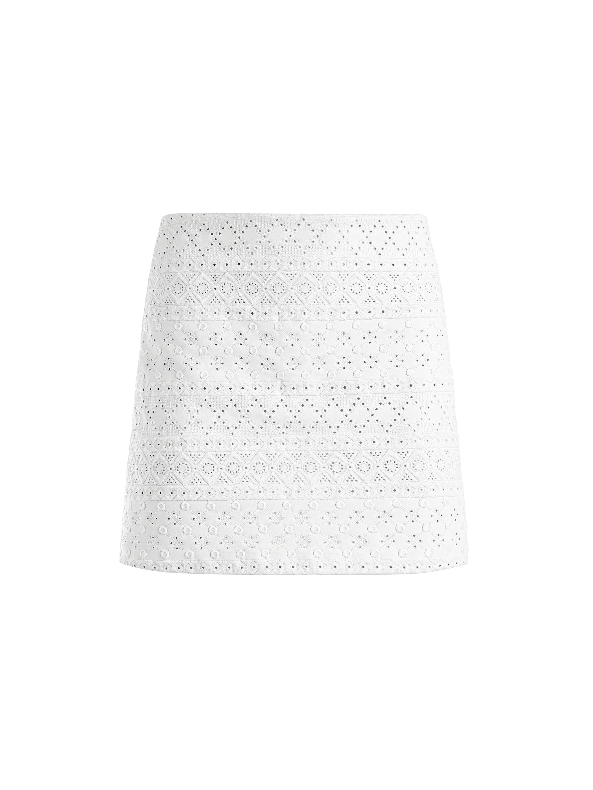 A perfect miniskirt in classic off white is a great way to transition your wardrobe from spring to summer. The Riley features an embroidered texture, mid rise, clean waistband and enough stretch to make it fit just-right. DETAILS - Mini skirt - A-line - Embroidered - Clean waistband - Mid rise - Back zipper closure - 60% polyester, 40% polyurethane - Dry clean only - Imported FIT - Model is wearing a size 2 and her measurements are 5’10”, 32” bust, 23” waist, 34” hips - Total length: 14 1/2" - Fits true to size, take your normal size