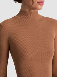 The sleekest base layer in your closet. Roberta is a ribbed camel turtleneck in a slim, fitted shape that hugs just right. With long sleeves and a full length hem, it layers seamlessly under blazers and jackets or stands alone with denim and minis. A staple made in an ultra soft rayon, it balances comfort with polish--effortless, elevated, and endlessly versatile. DETAILS - Tan turtleneck top - Ribbed - Fitted - 100% rayon - Dry clean only - Imported FIT - Model is 5'10" and wearing a size XS - Length from the shoulder: 21" - Fits true to size, take your normal size
