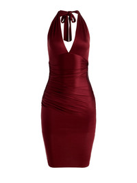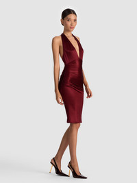 Sleek, sculptural, and made to turn heads. The Romy dress is crafted from a gorgeous oxblood acetate with just the right amount of stretch. Its sexy bodycon fit and deep V-neck are balanced by an unexpected knee length and flattering draped detailing. It’s pure evening energy- and worthy of any RSVP. DETAILS - Midi dress - Draped detailing - Knee length - Halter tie neck - Back zipper closure - 94% acetate, 6% elastane - Dry clean only - Imported FIT - Model is 5'10" and wearing a size 0 - Length from the shoulder: 32" - Fits true to size, take your normal size