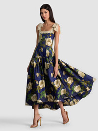The most gorgeous print on the dreamiest silhouette-our Rosalee tie shoulder midi dress is made for a princess. Cut from breezy cotton poplin, its fitted bustier bodice plumes out into a super feminine skirt with a fluttery hem. It's finished with adjustable ribbon straps and smocking in the back to conform to your shape. A true stunner that you'll feel gorgeous and glamorous in. DETAILS - Midi dress - Printed cotton poplin - Fit and flare - Structured corset bodice - Adjustable bow straps - Smocked back with zipper closure - 97% cotton, 3% elastane - Dry clean only - Imported FIT - Model is 5'10" and wearing a size 0 - Length from the shoulder: 50" - Fits true to size, take your normal size