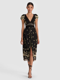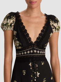 Rose takes the classic midi and elevates it with a scalloped lace trim, puff sleeves, and delicate buttons that feel like heirloom touches. A deep-V neckline at the front and back keeps things flirty, while the A-line cut flatters every step. Feminine and sophisticated, it’s the kind of dress that shifts effortlessly from weddings to dinner parties to nights out. DETAILS - Midi dress - Printed crepe viscose - Scalloped lace V-neck - Puffed sleeves - Front button closures - Back zipper closure - 100% viscose - Dry clean only - Imported FIT - Model is 5'10" and wearing a size 0 - Length from the shoulder: 50" - Fits true to size, take your normal size
