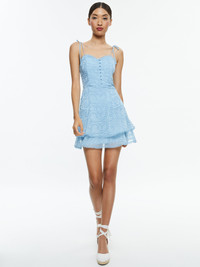 This flirty and fun minidress is an instant outfit that will make you feel amazing every time you put it on. We love the cute ruffle embellishments, eyelet fabric, the sweetheart neckline and buttoned bodice. Bonus: That smocking in the back for an adjustable fit. DETAILS - Mini dress - Ruffled skirt with embellished trim - Sweetheart neck with buttoned bodice - Eyelet paisley - Tie straps - Smocked back with exposed zipper closure - 100% polyester - Dry clean only - Imported FIT - Model is wearing a size 2 and her measurements are 5’10”, 32” bust, 23” waist, 34” hips - Length from the shoulder: 33" - Fits true to size, take your normal size