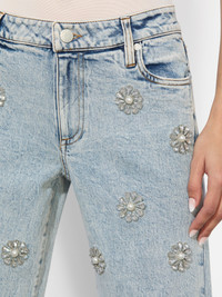 Denim is the backbone of all our wardrobes and here’s a new A+O way to wear it: with embellished appliques throughout. These epic jeans include a low rise, straight leg, frayed hem and full length. You will get compliments, you’ve been warned. DETAILS - Straight leg - Low rise - Hand-embellished crystals - Floral motif appliques - Frayed hem - Front button and zipper closure - 98% cotton, 2% elastane - Dry clean only - Imported FIT - Model is 5'10" and wearing a size 24 - Front rise: 9" - Inseam: 34" - Fits true to size, take your normal size