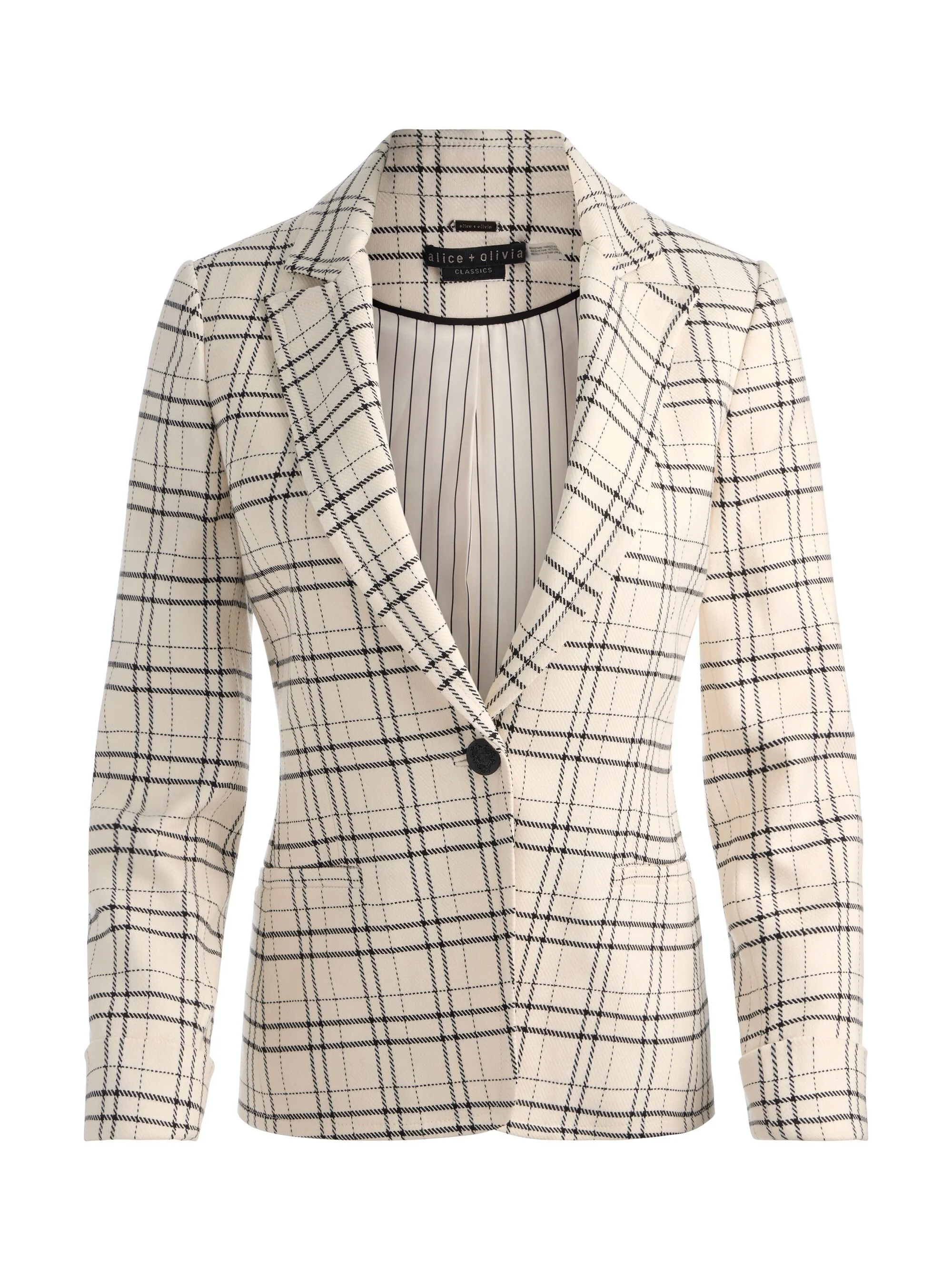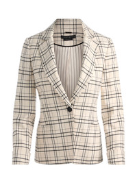 Every woman needs a perfect-fitting blazer. Cut from plaid twill, it’s tailored through the waist with structured shoulders and finished with rolled cuffs for a slightly undone feel. A single button closure adds polish. Ideal for elevating denim or anchoring a full suiting look. DETAILS - Plaid twill blazer - Slim fit - Cuffed sleeves - Peak collar - Single button closure - 64% recycled polyester, 34% viscose, 2% elastane - Dry clean only - Imported FIT - Model is 5'10" and wearing a size 0 - Length from the shoulder: 25 1/2" - Fits true to size, take your normal size