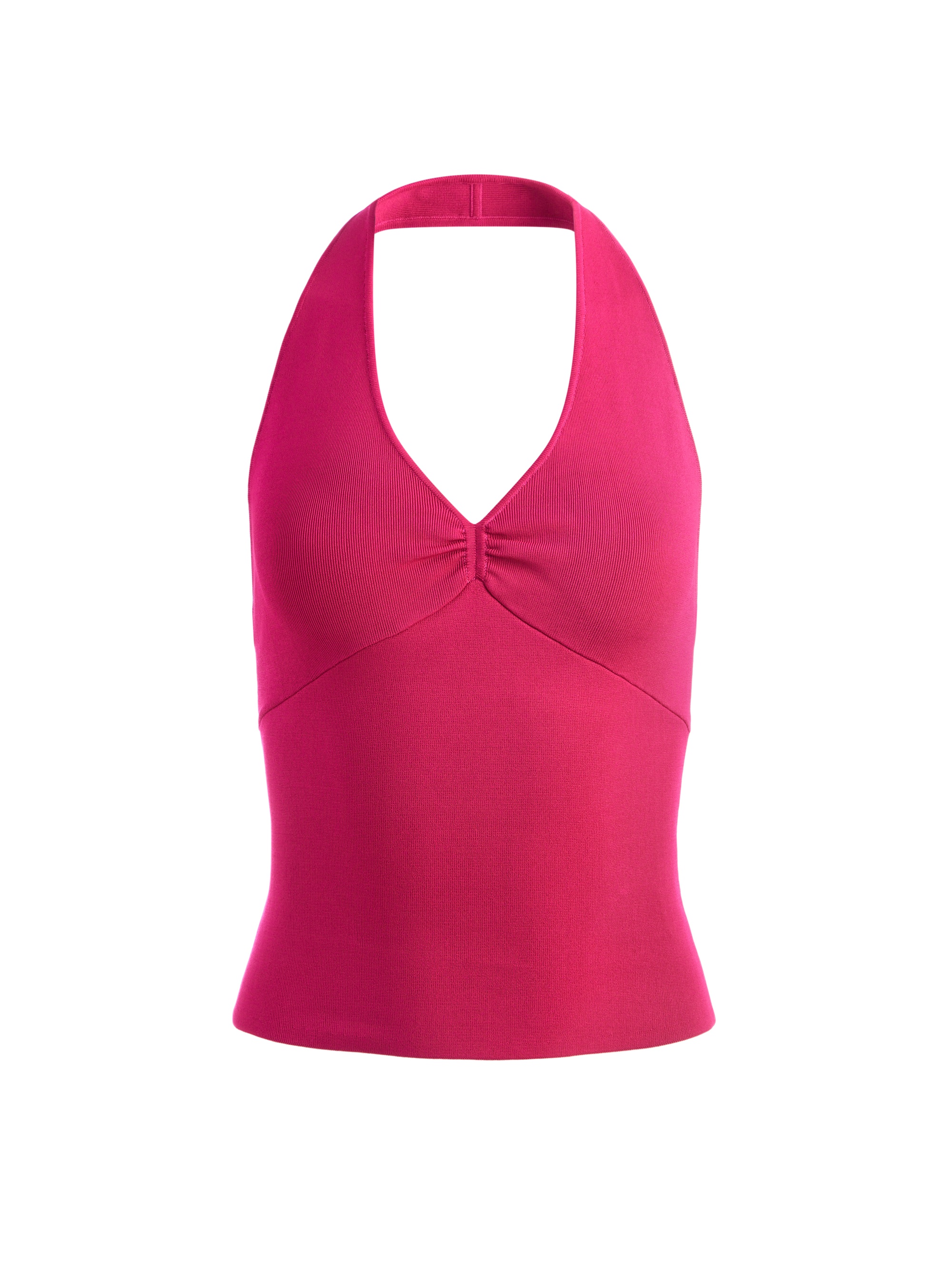 A not-so-basic basic, featuring a halter neck and cropped length. PRODUCT DETAILS - Halter neck - Cropped top - Form fitting - Ruching at neckline - Total length: 21 1/2” - 100% dull rayon - Fits true to size, take your normal size - Megan is wearing a size Small and her measurements are 5’10”, 32” bust, 23” waist, 34” hips - Dry clean only - Imported