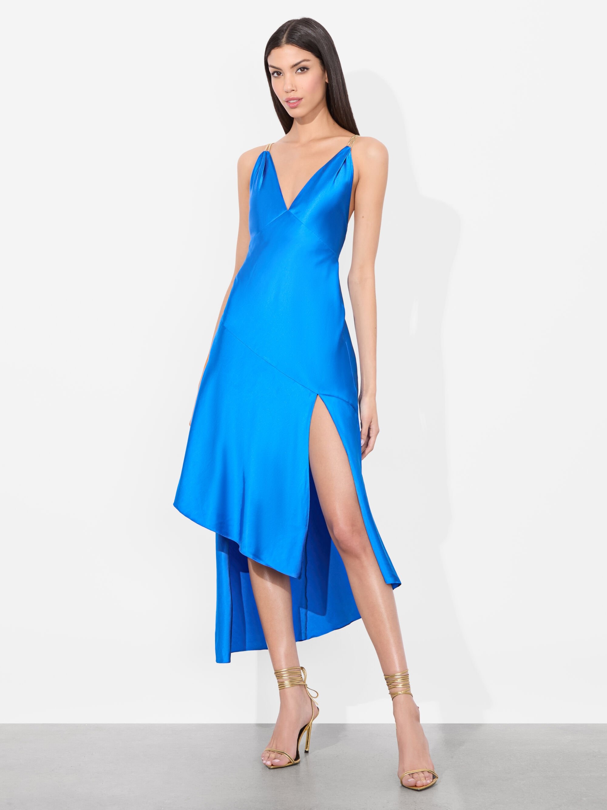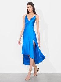Where sleek minimalism meets high-impact detail. The Savana 90s style midi dress is crafted from lustrous stretch charmeuse, featuring a deep V neckline, asymmetrical hem, and gleaming chain straps that double as built-in jewelry. Designed to catch the light and flatter the figure, it’s the kind of piece that owns the room without saying a word. DETAILS - Midi slip dress - Asymmetric hem - Chain straps - Stretch viscose charmeuse - Back zipper closure - 97% viscose, 3% elastane - Dry clean only - Imported FIT - Model is 5'10" and wearing a size 0 - Length from the shoulder: 43" - Fits true to size, take your normal size