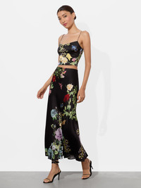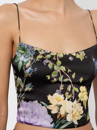 This bustier top is a sleek and modern take on a classic silhouette, offering a structured yet minimalist aesthetic. Featuring a cropped fit, it's designed with thin spaghetti straps and a fitted bodice that accentuates the waist. The contoured seams enhance the shape, while the smocked back ensures comfortable wear. A subtle sheen gives it an elevated, glamourous vibe. Perfect for layering, this top pairs effortlessly with high-waisted denim or any of our skirts. DETAILS - Bustier top - Printed stretch viscose charmeuse - Cropped - Smocked back with zipper closure - 97% viscose, 3% elastane - Dry clean only - Imported FIT - Model is 5'10" and wearing a size 0 - Length from the shoulder: 17 1/2" - Fits true to size, take your normal size