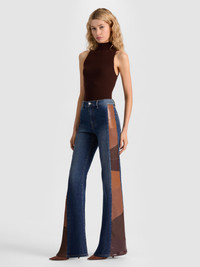 Our cult-favorite vegan leather patchwork jeans have returned! At a+o, we believe a touch of faux leather instantly elevates any look. Case in point: we transformed our classic SB High Rise with luxurious vegan patchwork details for an added edge. The result? Instant wow-factor. DETAILS - Bootcut jean - Slim fit - High rise - Vegan leather patchwork - Belt loops - Front button and zipper closure - Denim: 98% cotton, 2% elastane - Vegan leather: 100% polyurethane - Dry clean only - Imported FIT - Model is 5'10" and wearing a size 25 - Front rise: 10 1/2" - Inseam: 34 1/2" - Fits true to size, take your normal size