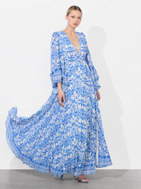 Selene is a romantic ruffled maxi dress that features a deep V-neckline, pleating, a smocked waist for an adjustable fit and long, dramatic sleeves. In a novelty print designed exclusively for us, it's bound to make you stand out wherever you wear it. DETAILS - Maxi dress - V-neck - Pleated - Smocked waist - Front slit - Long sleeves with ruffled hems - Exposed zipper back closure - 100% polyester - Dry clean only - Imported FIT - Model is 5'10" and wearing a size 0 - Length from the shoulder: 59" - Fits true to size, take your normal size