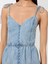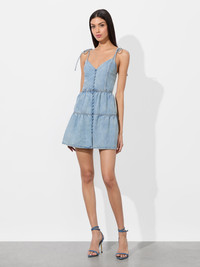 Soft structure meets effortless style in this tiered denim mini dress. With a fitted bodice, full button front, and breezy tiered skirt, Shanti offers a flattering silhouette that moves with ease. Thoughtfully tailored and rich in texture, it’s a wear-everywhere piece that easily transitions from daytime to dinner. DETAILS - Mini denim dress - Tiered skirt - Button front - Adjustable tie straps - Smocked back with zipper closure - 100% cotton - Dry clean only - Imported FIT - Model is 5'10" and wearing a size - Length from the shoulder: - Fits true to size, take your normal size