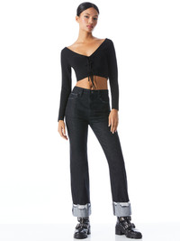 The perfect throw on pullover that can take any outfit up a notch. Wear it laced up or open, it's up to you. PRODUCT DETAILS - Pullover - Long sleeve - Cropped - Tie front - Total length: 15 1/2” - 100% dull rayon - Fits true to size, take your normal size - Aqua is wearing a size Small and her measurements are 5’10”, 32” bust, 23” waist, 34” hips - Dry clean only - Imported