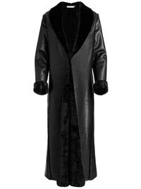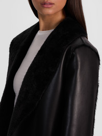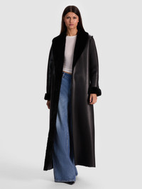 Shelby is everything you want in a winter coat: drama, warmth, and a forever-chic look. Cut in vegan leather and fully lined in plush faux shearling, it drapes to maxi length for that sweeping silhouette. The shawl collar softens the structure, while hook closures keep it streamlined. Equal parts cozy and commanding, this is outerwear that feels like a true investment- you’ll reach for it season after season and wonder how you lived without it. DETAILS - Maxi coat - Vegan leather exterior - Faux shearling interior - Shawl collar - Front hook closure - Faux leather: 100% polyurethane - Faux fur: 100% polyester - Dry clean only - Imported FIT - Model is 5'10" and wearing a size XS - Length from the shoulder: 55" - Fits true to size, take your normal size
