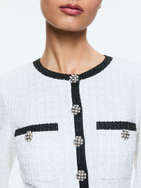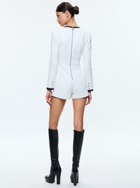 This elegant romper featuring detailed buttons and patch pockets can take you straight from the office to dinner, or anywhere really. DETAILS - Tweed romper - Long sleeve - Button front - Patch pockets - 76% polyester, 12% cotton, 10% acrylic, 2% elastane - Dry clean only - Imported FIT - Model is wearing a size 2 and her measurements are 5’10”, 32” bust, 23” waist, 34” hips - Length from the shoulder: 30" - Inseam: 2 3/4" - Fits true to size, take your normal size