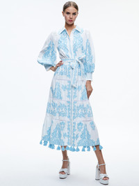This midi dress has so many things to love, including (but not limited to) the gorgeous print, the voluminous sleeves and the feminine collar. We love that it cinches at the waist and finishes in a full and feminine skirt. It's such an easy piece that you can throw on and be the best dressed wherever you are. DETAILS - Embroidered midi dress - Detachable tie belt - Collared - Tiered skirt - Hidden placket - Tasseled bottom - Blouson sleeves - 100% cotton - Dry clean only - Imported FIT - Model is wearing a size 2 and her measurements are 5'10", 32" bust, 22.5" waist, 34.5" hip - Total length: 51" - Fits true to size, take your normal size