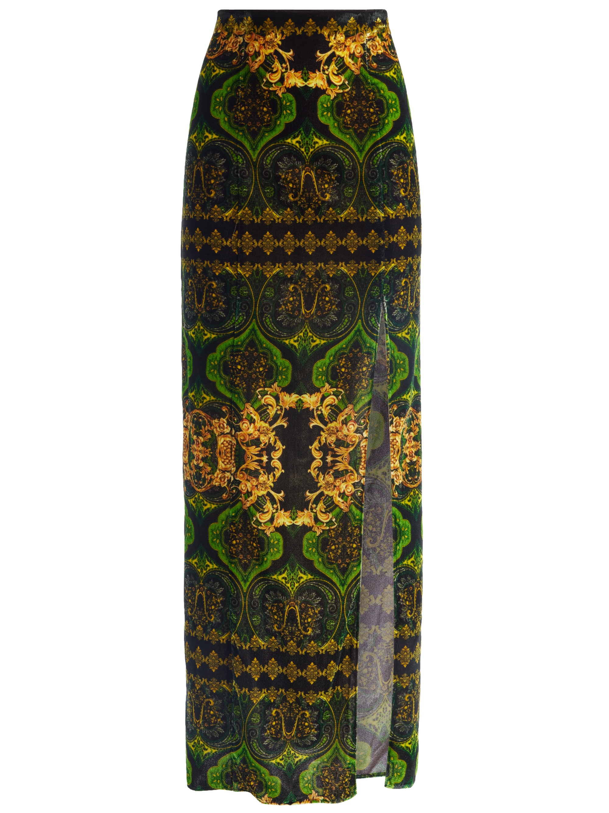 This skirt is a beauty (just like you). In our rendezvous print with a high slit, it's both feminine and fierce. In other words: Totally perfect. PRODUCT DETAILS - Maxi skirt - High front slit - Back zipper closure - Printed velvet - Total length: 43” - 75% viscose, 25% polyamide - Fits true to size, take your normal size - Caroline is wearing a size 2 and her measurements are 5'9", 30" bust, 23" waist, 34.5" hip - Dry clean - Imported