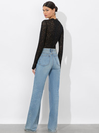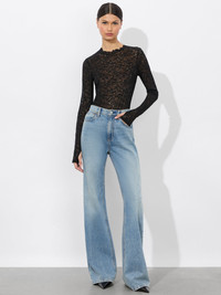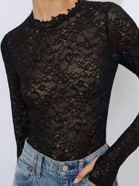 Our Taeyn black lace bodysuit is flirty, feminine, and flattering. It’s cut from a romantic stretch-nylon for a smooth, seamless finish. Its artful high-neck gives a distinct look. Underpin it with a tonal bra for coverage and wear with everything from wide-leg denim to miniskirts. DETAILS - Sheer lace bodysuit - Long sleeve with thumbholes - Thong bottom with snap closures - Back zipper closure - 88% nylon, 12% elastane - Dry clean only - Imported FIT - Model is 5'10" and wearing a size XS - Length from the shoulder: 23 1/2" - Fits true to size, take your normal size