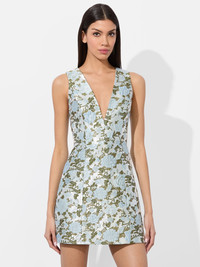 A metallic moment worth making an entrance for. Our Tatum mini dress stuns in shimmering printed jacquard, designed with an A-line silhouette that flatters and flows with every move. The plunging V-neckline adds a touch of allure, while a smocked back and hidden zipper ensure a smooth, comfortable fit. Finished with a subtle sheen and striking detail, this standout style is guaranteed to be a conversation piece. DETAILS - Mini dress - V-neck - Printed metallic jacquard - A-line fit - Smocked back with zipper closure - 86% polyester, 14% nylon - Dry clean only - Imported FIT - Model is 5'10" and wearing a size 0 - Length from the shoulder: 33" - Fits true to size, take your normal size