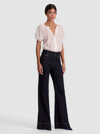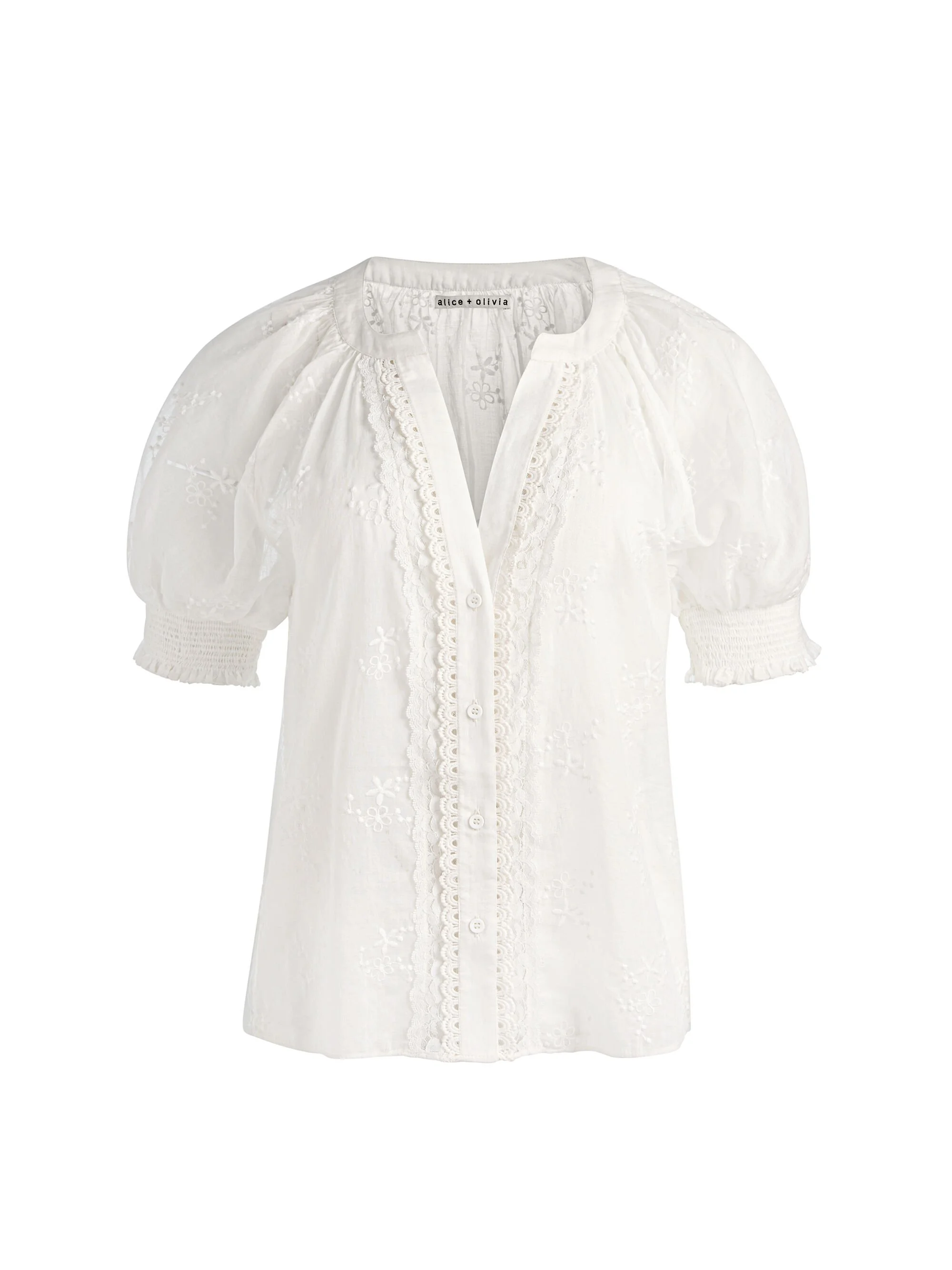 A romantic take on the classic white blouse. Thalia’s embroidered cotton voile, puff sleeves, and lace-trimmed placket bring delicate texture to an everyday staple. Semi-sheer and light, it layers beautifully under knits or stands on its own for softer styling moments. Wear it with denim or a skirt when you want easy charm with zero effort. DETAILS - Puff sleeve blouse - Embroidered cotton voile - Button front - Semi sheer - Lace trimmed placket - 100% cotton - Dry clean only - Imported FIT - Model is 5'10" and wearing a size XS - Length from the shoulder: 24" - Fits true to size, take your normal size
