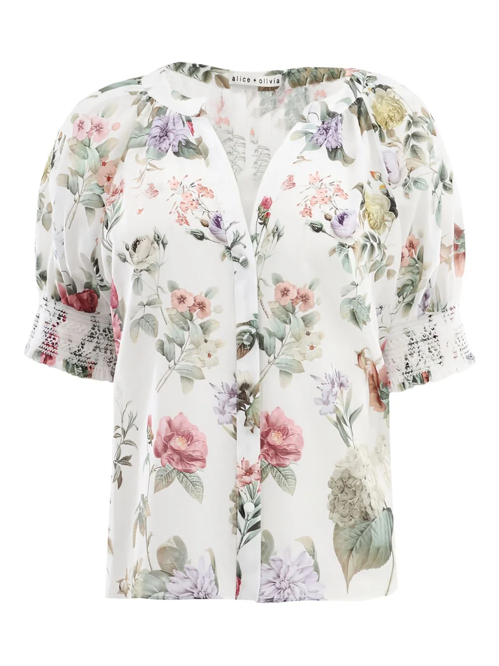 puff-sleeve floral blouse Highlights - Off-white - Floral print - Button-down fastening - Puff sleeves - Elasticated cuffs - Lace trim Imported Composition Cotton 70%, Silk 30% Washing instructions Read Manufacturer Guidelines