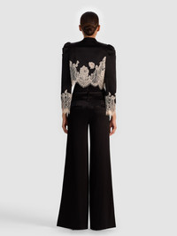 Old-world romance meets modern tailoring in this cropped jacket. Crafted in sleek black satin, it’s adorned with intricate ivory lace and scalloped edges that feel both ornate and wearable. Puff-shoulder sleeves and a structured silhouette add drama, while the open front makes it the perfect layering piece over slip dresses, high-waist trousers, or anything in need of a little couture-level magic. DETAILS - Cropped jacket - Toyo shiny satin - Embroidered lace trim - Puffed shoulders - Mock neck with front hook closure - 75% triacetate, 25% polyester - Dry clean only - Imported FIT - Model is 5'10" and wearing a size XS - Length from the shoulder: 17 1/2" - Fits true to size, take your normal size