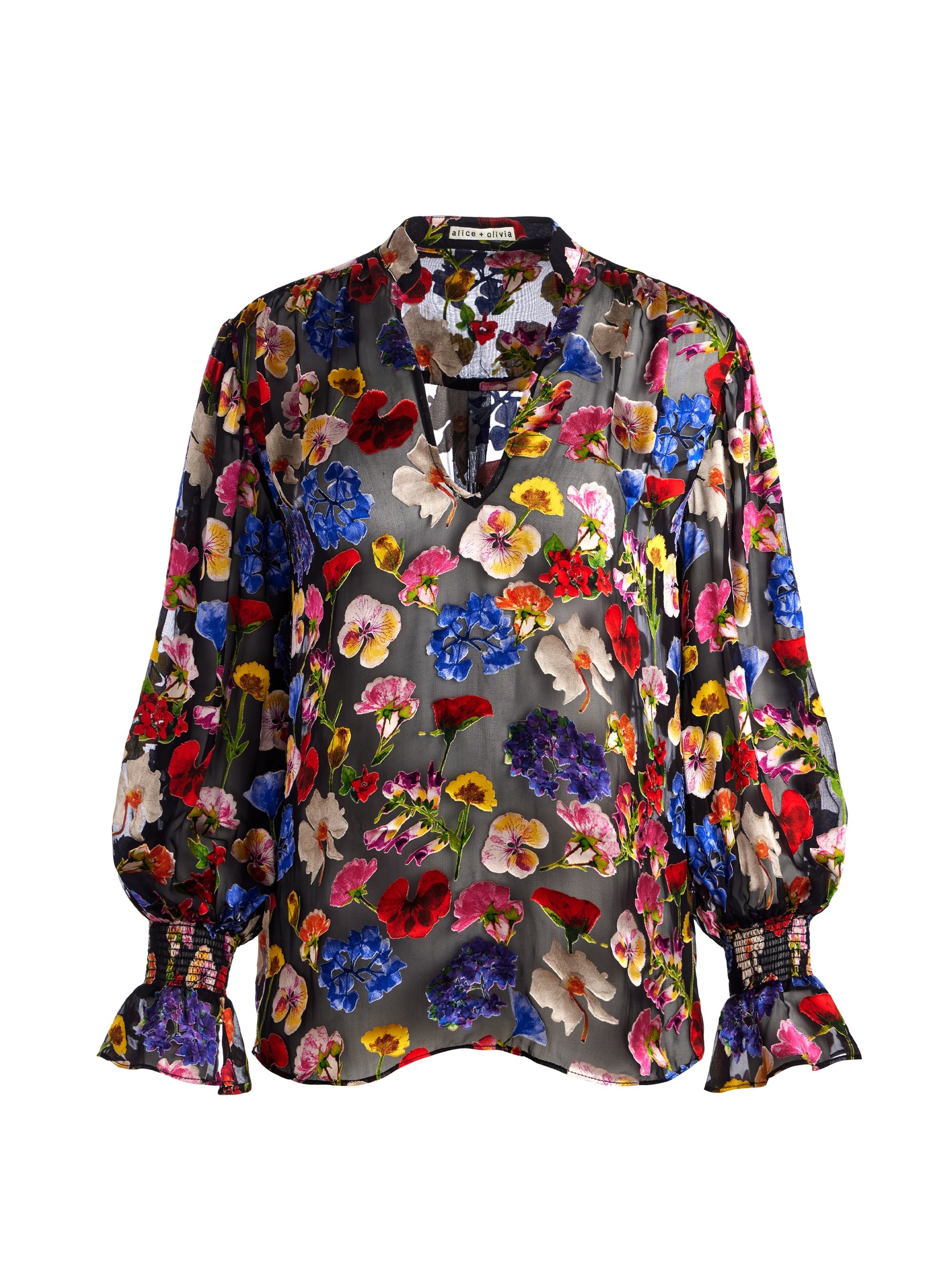 Onica is a romantic blouse with a V-neckline, blouson sleeves and semi-sheer fabric (so you can layer it over your favorite bra). We love it tucked into pencil skirts or loose over billowy trousers. DETAILS - Semi sheer - Printed - V-neck - Full length - Blouson sleeves - 61% viscose, 39% silk - Dry clean only - Imported FIT - Model is wearing a size Small and her measurements are 5’10”, 32” bust, 23” waist, 34” hips - Length from the shoulder: 27" - Fits true to size, take your normal size