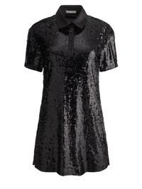 A polo dress, given the A+O treatment. Namely: sequins, a cool boxy fit, short sleeves and a contrasting satin collar. DETAILS - Polo dress - Boxy fit - Sequined - Short sleeve - Satin collar with buttoned closure - 91% nylon, 9% elastane - Dry clean only - Imported FIT - Model is wearing a size Small and her measurements are 5’10”, 32” bust, 23” waist, 34” hips - Length from the shoulder: 32 1/2" - Fits true to size, take your normal size
