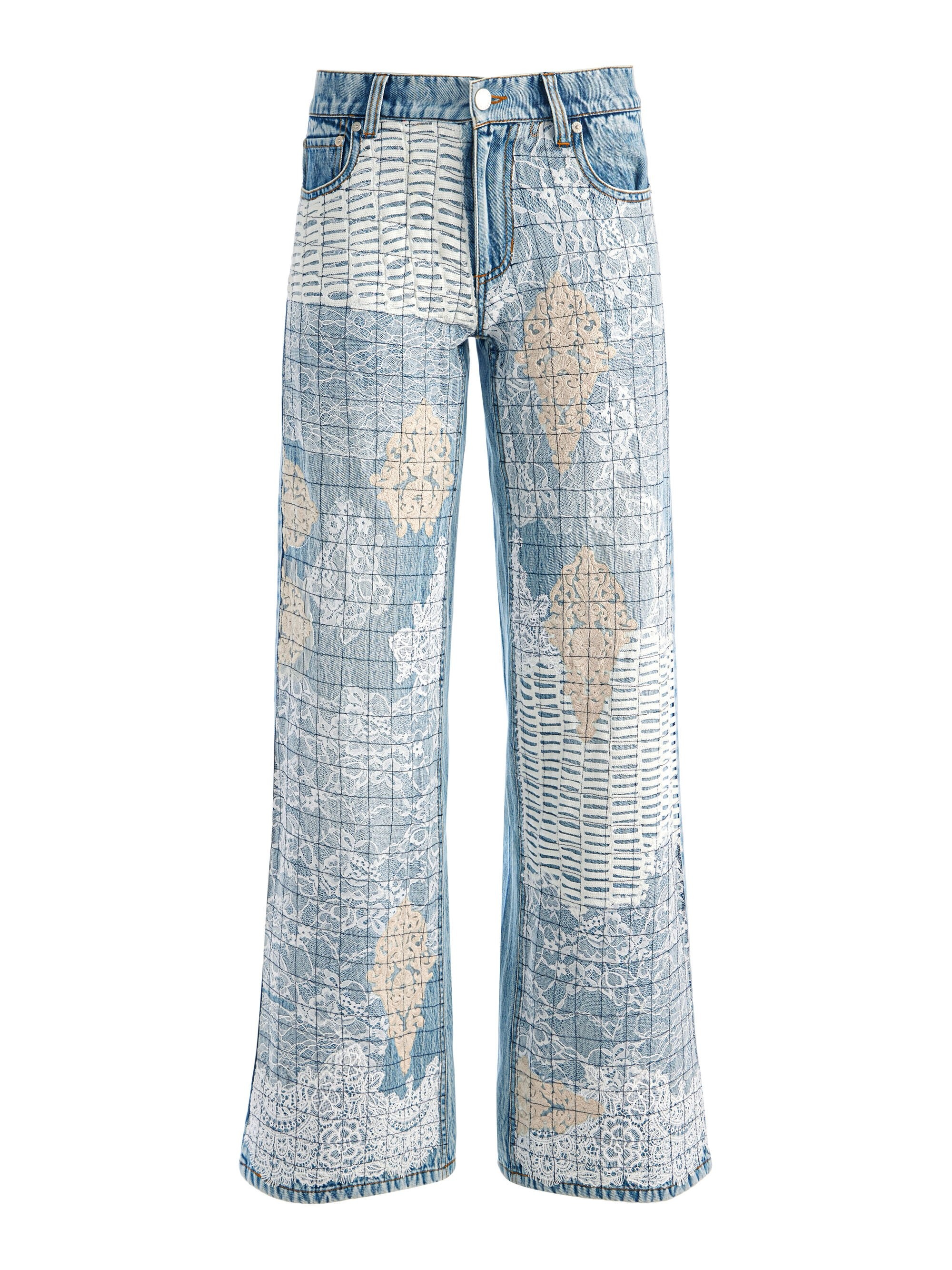 These wide leg jeans are such an easy way to add some personality to any look. Various lace patterns are hand-cut and intricately topstitched to the denim to create a patchwork effect. A low rise and baggy fit offers an instant cool-girl vibe. Add one of our fitted tank tops and you are out the door. DETAILS - Wide leg jean - Low rise - Hand-cut lace topstitched denim - Front button and zipper closure - 100% cotton - Dry clean only - Imported FIT - Model is 5'10" and wearing a size 26 - Front rise: 9 1/4" - Inseam: 34 1/2" - Runs small, we recommend sizing up one size