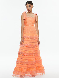 There are so many things to love about the Vega dress. Starting with that flattering coral shade. What you'll also love: The straight neckline, adjustable tie straps, tiers of lace and adjustable smocking in the back. DETAILS - Maxi dress - Straight neck - Tie straps - Tiered - Embroidered - Smocked back - Side zipper closure - 70% lyocell, 30% polyester - Dry clean only - Imported FIT - Model is wearing a size 2 and her measurements are 5’10”, 32” bust, 23” waist, 34” hips - Length from the shoulder: 59 1/2" - Fits true to size, take your normal size