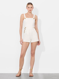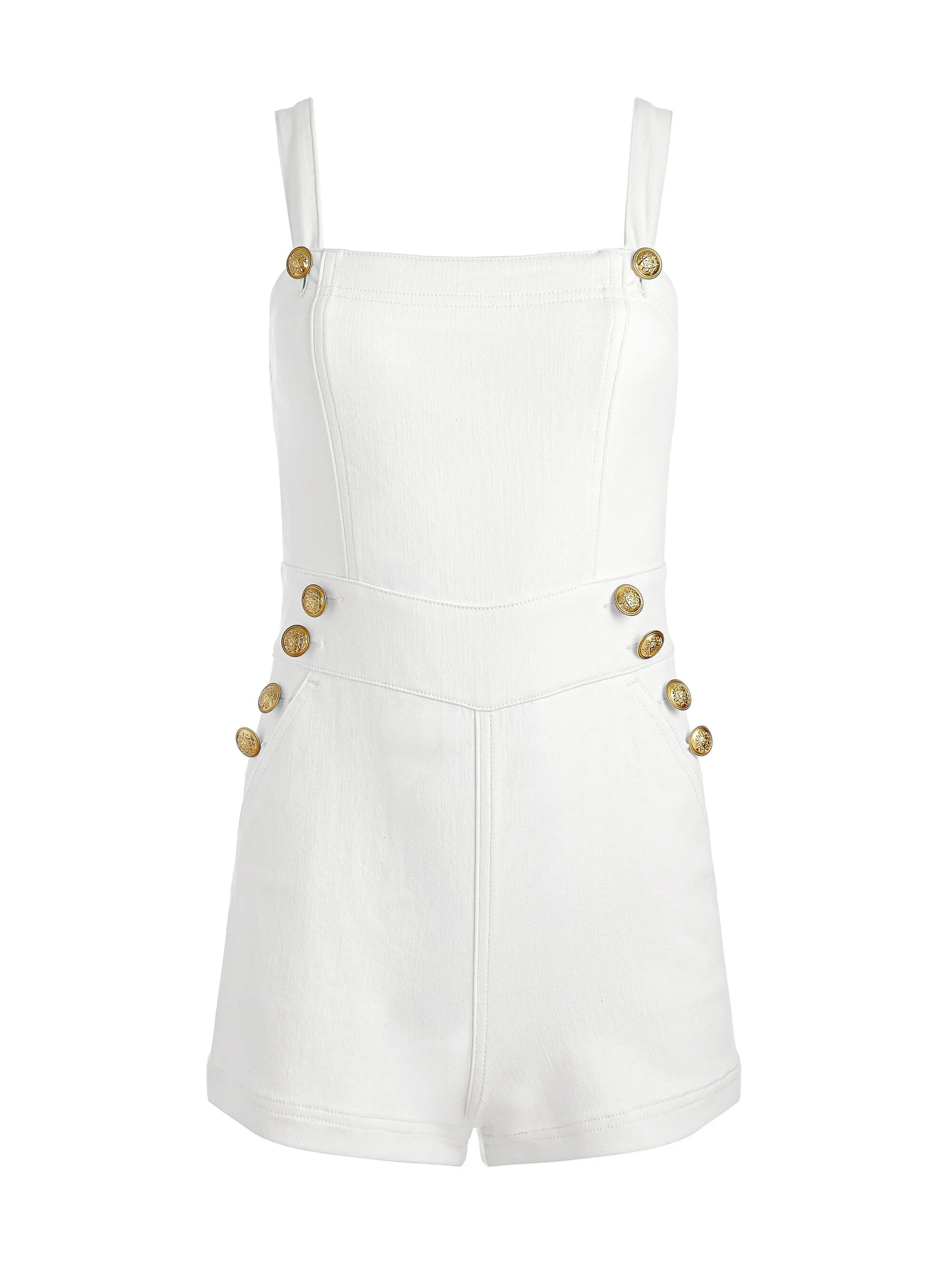 This is not your average denim romper. With a fitted silhouette that hugs in all the right places, gold statement buttons, and a smocked back for a just-right fit, it’s equal parts polished and playful. Made from soft, stretchy denim that moves with you, it’s the one-and-done piece you’ll reach for all summer long. Flirty, flattering, and totally fun. DETAILS - Denim romper - Embellished gold buttons - Smocked back with zipper closure - 94% cotton, 5% elastomultiester, 1% elastane - Dry clean only - Imported FIT - Model is 5"10" and wearing a size 26 - Length from the shoulder: 30" - Inseam: 2 1/2" - Fits true to size, take your normal size