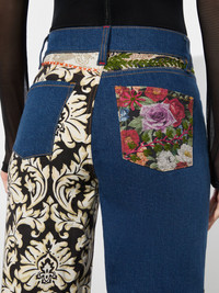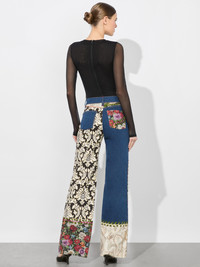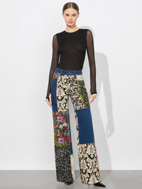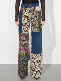 Meet the Weezy jean. She has a long wide leg and incredibly flattering high waist (not that you need any help). Now adorned in the most epic mixed media patchwork, she is anything but your average blue jean. DETAILS - Wide leg - Mixed media patchwork - High rise - Front button and zipper closures - Belt loops - 98% cotton, 2% elastane - Dry clean only - Imported FIT - Model is 5’10” and wearing a size 26 - Front rise: 11 1/4" - Inseam: 34 1/2" - Runs small, we recommend sizing up one size
